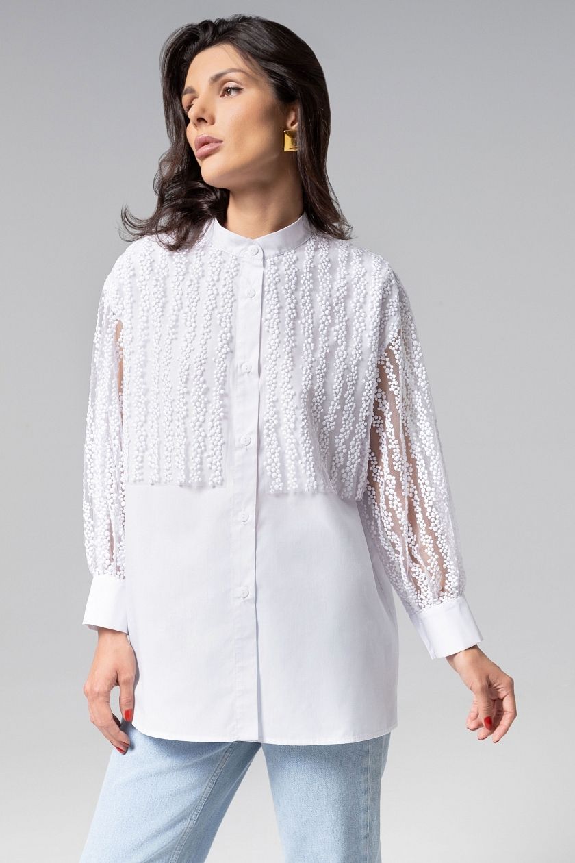 Рубашка белая комбинированная с вышивкой от компании Charutti. Модель свободного силуэта, выполнена из рубашечной ткани «поплин». Воротник-стойка. Втачные длинные рукава на манжетах, со спущенной линией плеча. Центральная застёжка на петли и пуговицы. Идеальный выбор для городских модниц.
