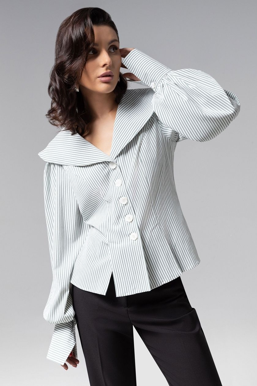 Рубашка в тонкую полоску от компании Charutti. Модель приталенного силуэта, выполнена из поливискозы. Широкий воротник, воздушные рукава изделия создают привлекательную игру контрастов. По переду застёжка на пуговицы. Идеальный выбор для создания стильного образа.