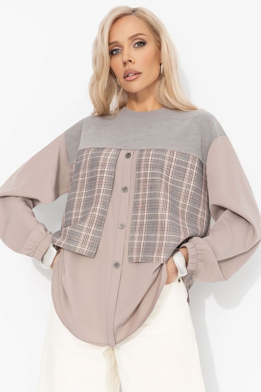 Свитшот комбинированный бежевый с имитацией рубашки от компании Charutti. Модель прямого силуэта, выполнена из плательной ткани "ниагара" и трикотажа. Круглый вырез горловины. Втачные длинные рукава на резинке, со спущенной линией плеча. Низ фигурный. Идеальный выбор на каждый день.