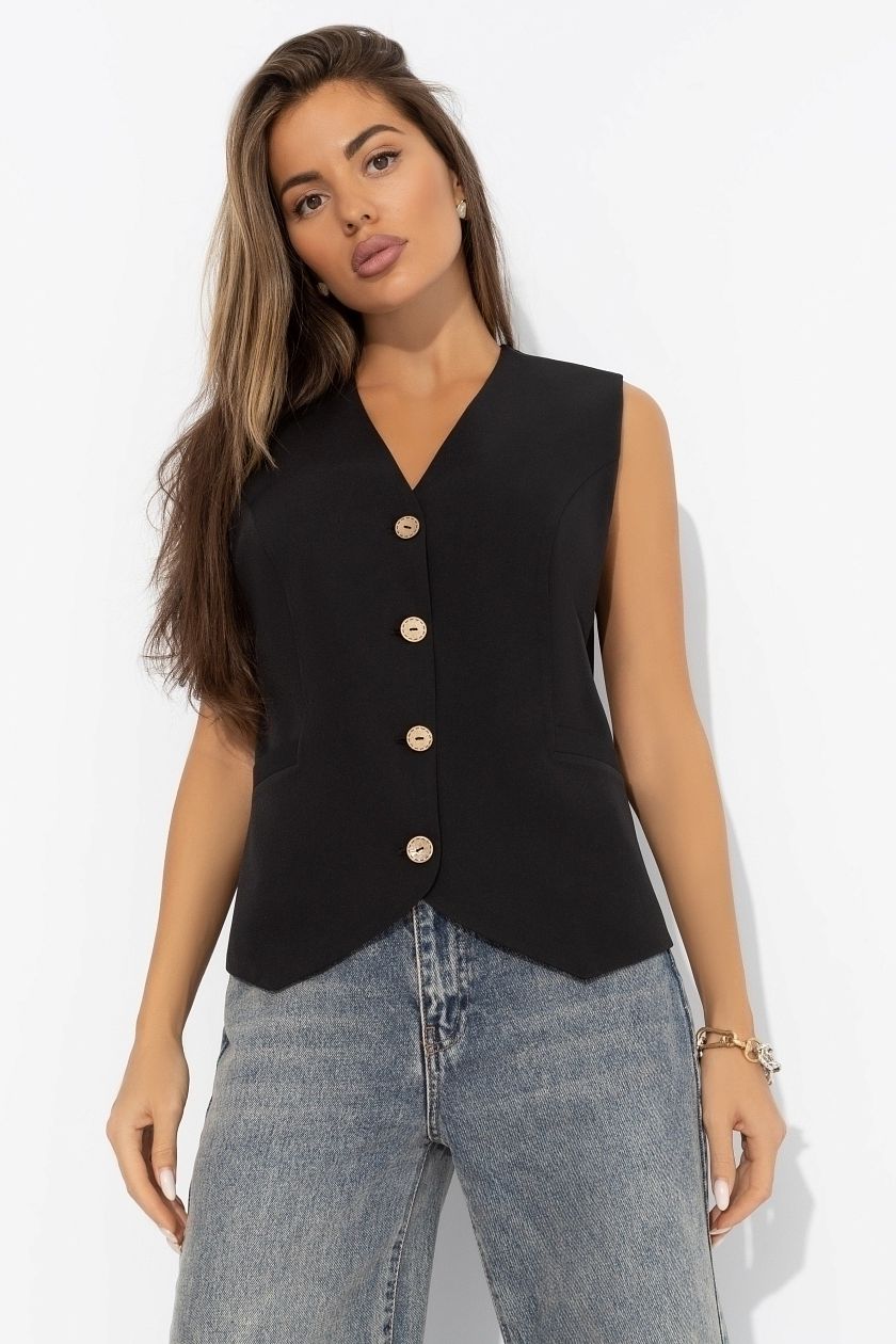 Жилет чёрный приталенный от компании Charutti, выполнен из костюмного полотна. Имитация карманов. Хорошо смотрится как самостоятельный предмет гардероба и как второй слой. Прекрасное решение для создания стильного образа.