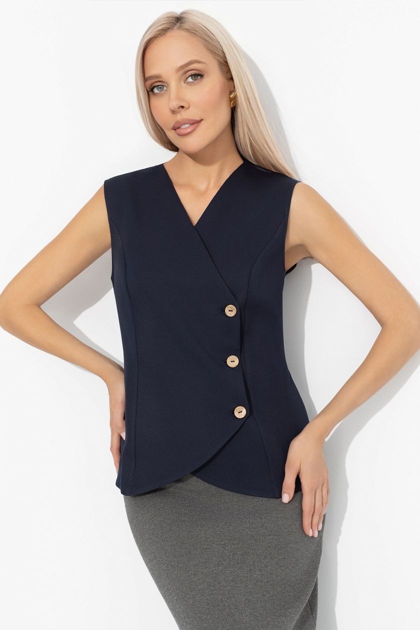 Жилет синий приталенный от компании Charutti, выполнен из костюмного полотна. Жилет в деловом стиле. Изделие укороченное. Асимметричное расположение пуговиц изделия. Без подклада. Прекрасное решение для создания стильного образа.