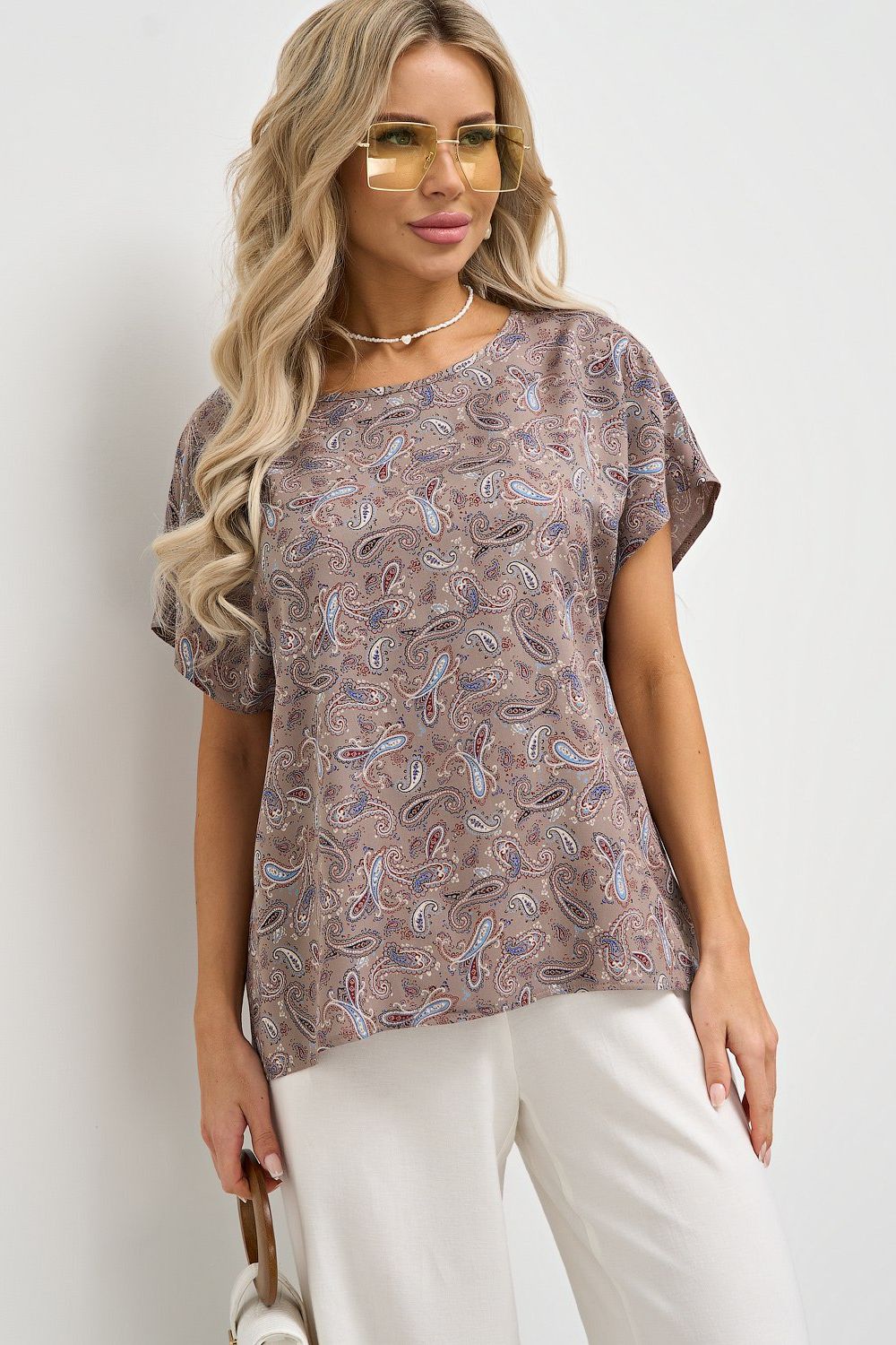 Блузка тёмно-бежевая с принтом от компании Jetty. Изделие прямого силуэта, выполнено из штапельного полотна. С круглым вырезом горловины. Короткий цельнокроеный рукав. Интересная блуза хорошо комбинируется с однотонными юбками, брюками или джинсами.