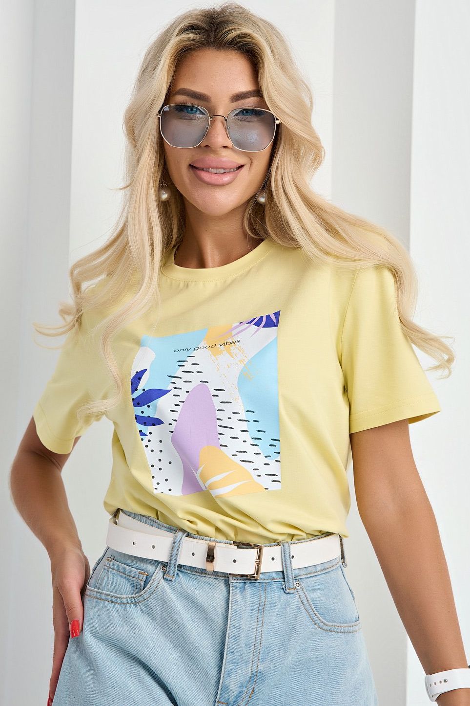 Футболка трикотажная жёлтая с принтом от компании Jetty. Модель свободного силуэта, с округлым вырезом горловины. С короткими втачными рукавами. Линия плеча спущена. Прекрасный вариант для любого мероприятия.