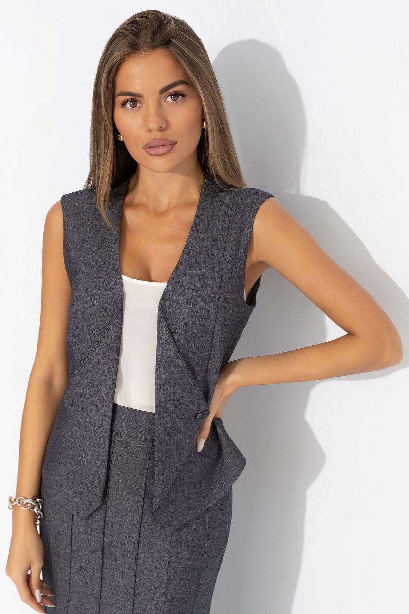 Жилет однотонный серого цвета от компании Charutti. Модель приталенного силуэта с акцентными отворотами, которые могут быть застегнуты. Выполнен из костюмного полотна. Прекрасное решение для создания стильного образа.