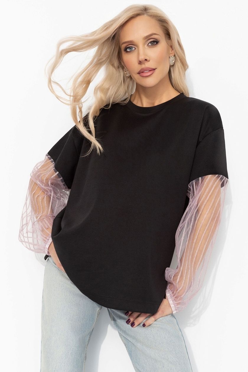 Футболка чёрная с декоративными рукавами от компании Charutti. Модель прямого силуэта, выполнена из трикотажной ткани "милано". Часть рукавов оформлена тонким гипюром. Линия плеча спущена. Деликатные разрезы по бокам изделия. Идеальный выбор на каждый день.