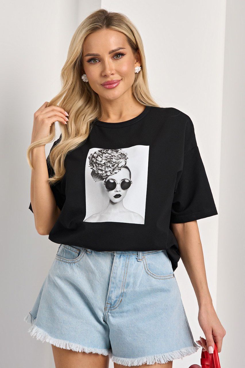 Футболка трикотажная чёрная с принтом от компании Jetty. Модель свободного силуэта, с округлым вырезом горловины. С короткими втачными рукавами. Линия плеча спущена. Прекрасный вариант для любого мероприятия.